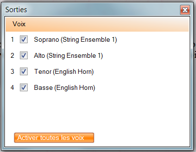 Les différentes voix peuvent être jouées séparément ou ensemble, à volonté. On peut choisir plusieurs voix (soprano, alto, ténor, basse). Par défaut, les quatre voies sont jouées ensemble. Pour désélectionner une ou plusieurs voix, il faut cliquer dans la case en face de la voix concernée. Pour réactiver une ou plusieurs voix, il faut cliquer sur la case de la voix désirée, ou bien cliquer sur le bouton « Activer toutes les voix ».