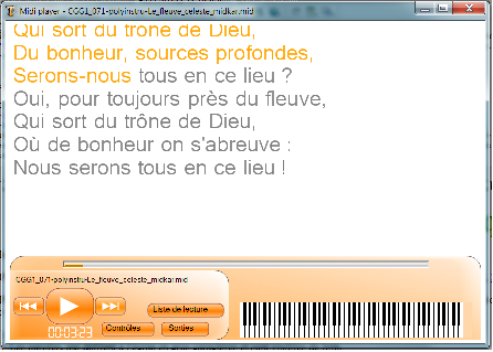 1) La musique des cantiques est jouée au moyen de la carte-son de l'ordinateur. Elle reproduit des instruments divers listés dans la fenêtre « Sorties » (voir image un peu plus loin dans la page).