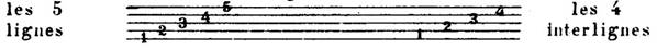 La portée est un ensemble de 5 lignes horizontales, également espacées. Entre elles il y a 4 interlignes. Les lignes et les interlignes se comptent de bas en haut :